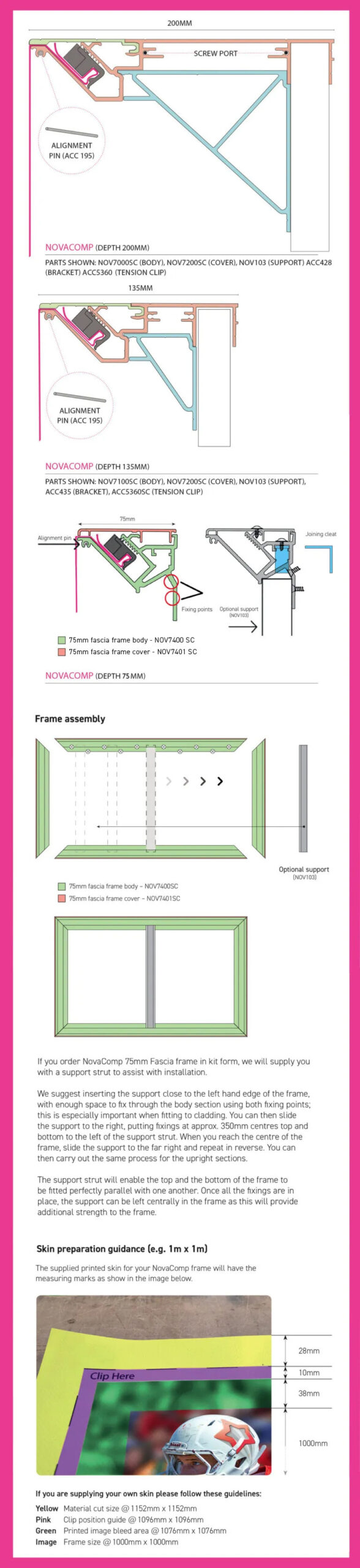 Available at three different depths, NovaComp can provide the solution to your illuminated and non-illuminated flex-face requirements. Tensioned using the black clip, NovaComp uniquely employs side support sections increasing the robustness of this system preventing any distortion. The 75mm fascia frame is a good alternative to folded trays as it is not only cost effective, but it eliminates the need for joins in the face. With two fixing points around its perimeter, the fascia frame can be fitted to any surface, including cladding. With the option to be supplied in kit form for assembly on the wall, or made up with supports and/or a back, installation couldn’t be simpler.
