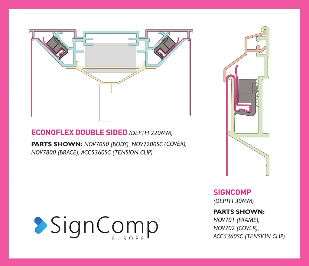 As an approved SignComp fabricator, we have full access to both the non-illuminated fascia frame and the double-sided Econoflex profiles. These complement our other black clip systems. The skins are tensioned using the same black clip as NovaComp, and are installed using the purpose designed tool.